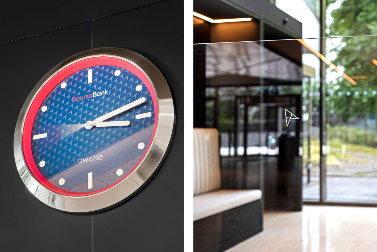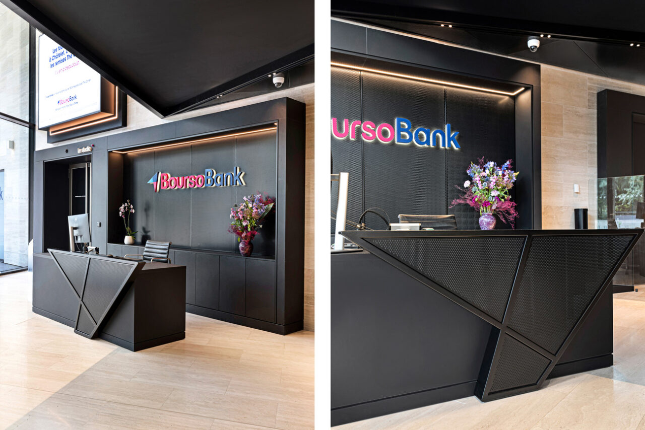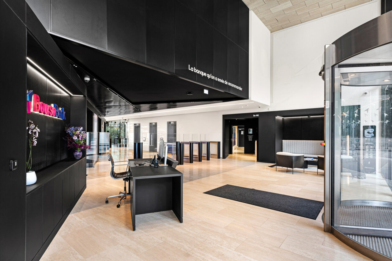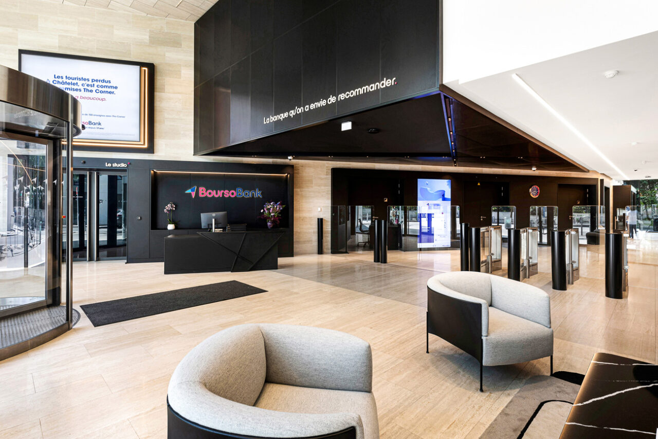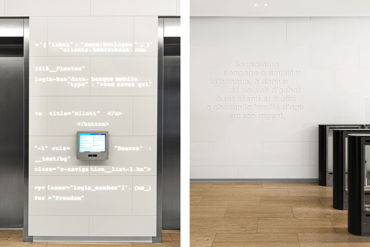 Nous avons complètement réinventer le hall d’accueil du siège de BoursoBank, afin d’y déployer la nouvelle identité de la marque et de transformer un lieu de passage en vitrine de la culture d’entreprise.